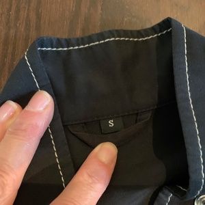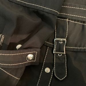 Beautiful jacket from famous high quality brand FAY. Bought in Italy a few years ago. Black with contrast white stitching. Double sided zipper at front opening with snaps. Pocket details at front. Self belt. Embossed FAY snaps and zip pullers. Size Small - as this is a European size, I measured the jacket and found the chest circumference 1 inch below armholes to be 38" 1/2 and back length from high point shoulder 28".