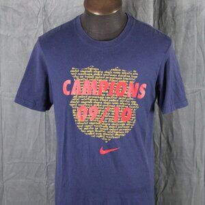 Up for sale is a retro Soccer shirt. It has a blue base colour with the FC crested logo on the chest with 09/10 Champoins across it and the Nike Swoosh underneath. The back of the shirt has don't about the season think about history and write the future in Spanish. What a great shirt do not miss out on it.