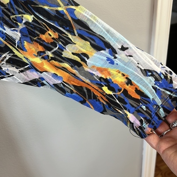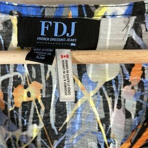 FDJ Paint Splatter V Neck Faux Wrap Top 3/4 Sleeves Lightweight Size Small. In excellent condition. Cotton Polyester blend. This top is sheer and lightweight. Beautiful colours!