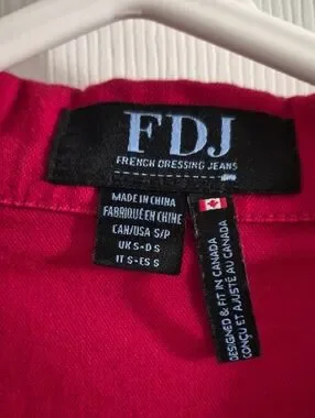 FDJ jean-style jacket in a vivid raspberry-red hue. Classic collar with button-front closure for easy layering. Soft, structured cotton blend offers comfortable everyday wear. Versatile piece that pairs well with casual and smart-casual outfits. Size is small but fits like a medium.