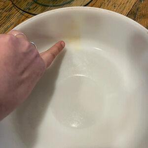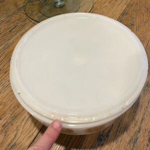 FEDERAL GLASS Vintage 60s Large Sunflower Milk Glass Casserole Dish & Lid Several small imperfections, a chip on the lid, stains in the dish, but still in good condition.