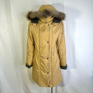 FEMINELLA BROWN PARKA COAT LONG WINTER TAN COAT FUR TRIM ON HOODIE SIZE SMALL