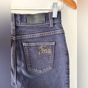 Stylish Fendi jeans in dark blue with branded back pocket stitching. High rise, slim fit leg, classic jean!
