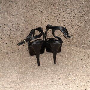 Size 37.5, about a 7, measures 9.5" via insole with 1" platform, 5" stiletto and 3" wide.