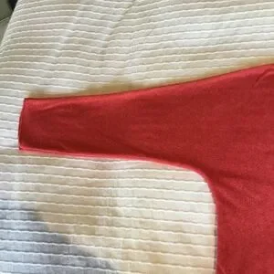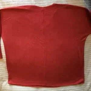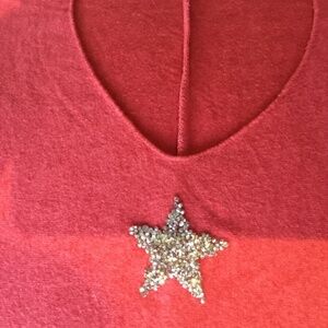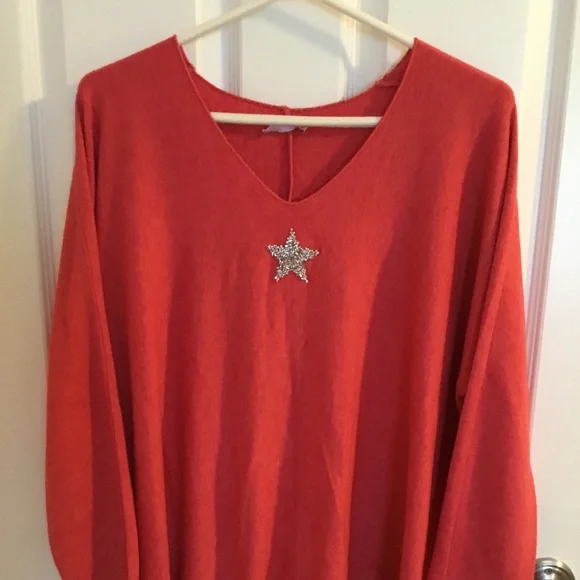 Beautiful v-neck sweater with a silver star embellishment on the front. 3/4 length sleeves, straight hem falling at hip level, and feels like cashmere to wear! So comfy!! Looks fabulous with leather pants, leggings, jeans or dress pants. Perfect for the festive season! Hand washable. Very good condition! (Red/0range colour, Fits L/XL)