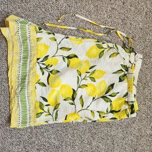Bright and summery lemon print shorts with green and yellow border detail. Lightweight woven fabric with an elastic waistband and drawstring tie finished with gold-tone beads. Perfect for casual wear, vacations, or beach days.
