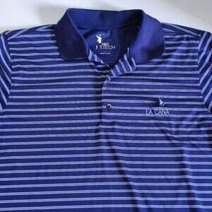 F&G Tech golf polo shirt men's size L navy blue light blue stripes pattern
