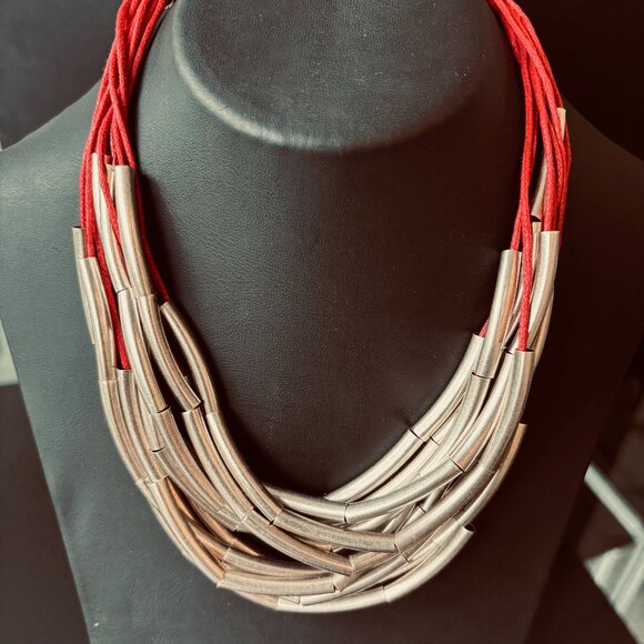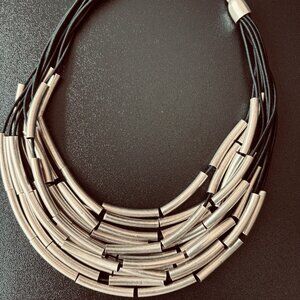 FICELLE necklace features eleven rows of silvery metal tubes meticulously strung on cotton thread. Each row is wrapped and layered, creating a striking, multi-dimensional piece that combines the industrial sheen of metal with the softness of the thread for a unique and stylish accessory. The tubes are wrapped-up and layered upon one another.