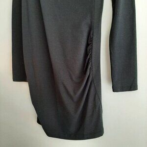 • Long sleeve, faux wrap deep vee neck dress in black with one side ruching detail. Unlined, pullover style.