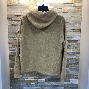Topped with a fuzzy teddy fabrication and the brand’s logo across the chest.