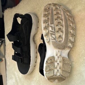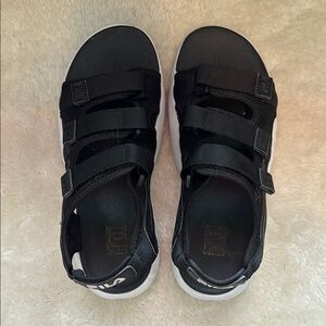 Experience the perfect blend of style and comfort with Fila's black and white sandals, featuring a sporty design with adjustable straps and a cushioned sole for all-day support.