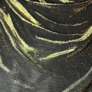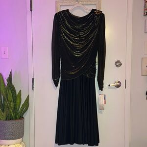 The dress is a black long-sleeved dress with a draped and metallic or sequined bodice, and a plain long skirt.