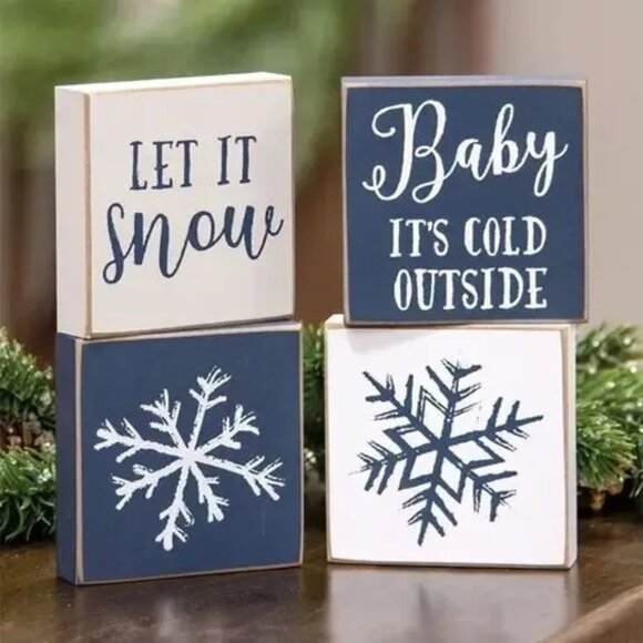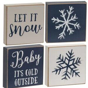 Baby, it’s cold outside, so stay inside the cozy farmhouse with the Let It Snow/Snowflake Square Block assortment. These lovely wooden blocks have dark blue and white finishes with distressed edges and they measure 3" square with a .75" depth. One block reads ‘Let it snow’ in dark blue on white. Another states ‘Baby It’s Cold Outside’ in white script and text on blue. There is one blue and one white block each with a distressed style snowflake in the opposing color. These blocks look lovely displayed in pairs of one sign and one snowflake. Or display as a group or individuals with Winter-florals and candles.