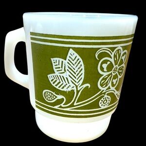 Vintage Fire King mug featuring the Flower Daisy pattern in avocado green. This milk glass mug is in excellent, clean, vintage condition with no chips or cracks.