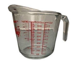 Vintage Fire King/Anchor Hocking measuring cup. No chips or cracks, minimal wear on the lettering. Measures 1 litre or 4 cups. About 5” tall and 5.5” in diameter