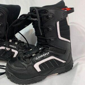 NWOT- Mens snowboarding boots. New! Size 5.5. Never used. Double laced. Black/white. Features synthetic water proof PU leather, fixed performance cuff, medium flex, traditional lacing system & embroidered logo. Also featuring FIREFLY’s Feather Lite Outsole with a PU cupped low profile for increased feel & responsiveness. Comes with an added heel & forefoot shank for extra support that creates an excellent power transfer system. With a quick pull lace system on the liner, warm reinforced synthetic fabric the FIREFLY is built to withstand the elements!