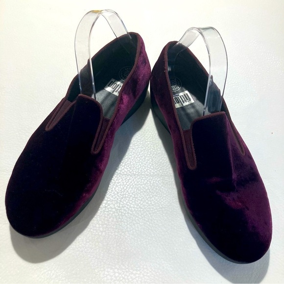 FITFLOP Sz 10 Superskate Burgundy Velveteen Flats Slip-on Comfort Shoes. Super chic and comfortable. Dress up or down. Trendy black cherry colour. Like new.