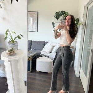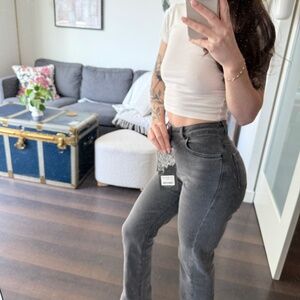 Stylish straight leg jeans. Dark gray color. Perfect for casual wear. Comfortable fit.