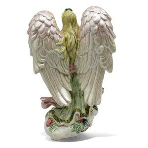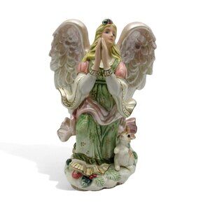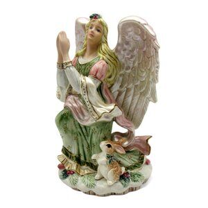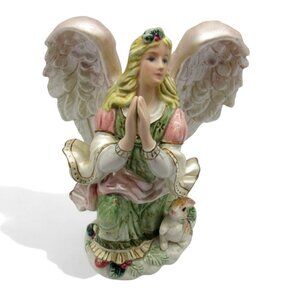 This Fitz & Floyd figurine showcases a delicate angel kneeling in prayer, accompanied by a charming rabbit.