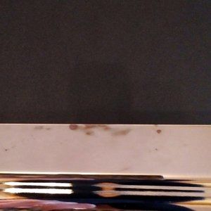 Never used; taken out of box only for pics--that's when I noticed some discoloration on one edge & corner, and a small mark on the back. Tried to take lots of pics--but it's hard to see because of the reflection of light!