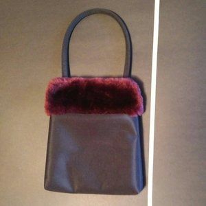 FLASH SALE! Super Cute Mini-Bag, Black, Burgundy Faux-Fur Trim, Firm Handle