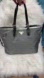 Stylish Prada tote in grayish green nylon. Features sleek black leather handles. Ideal for everyday use with elegance. In good used condition, signs of usage on handles but still strong, corners are good, no holes, no rubbings, clean interior. White tag intact.