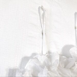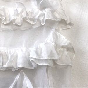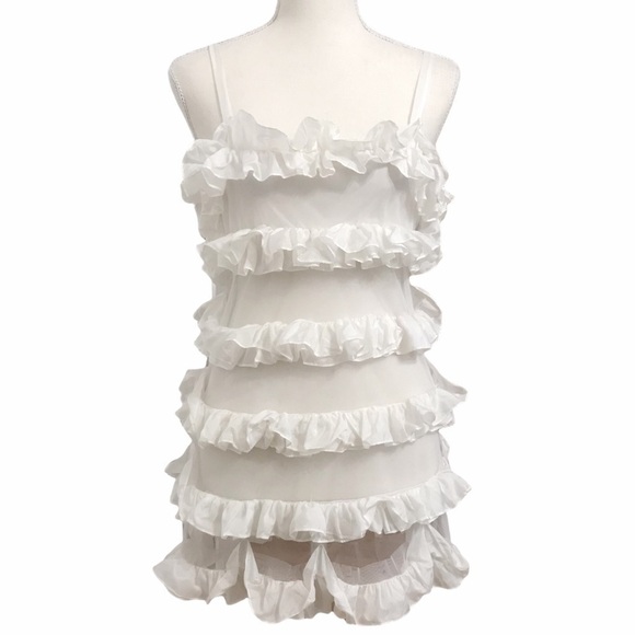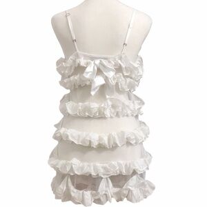 FLORA NIKROOZ WHITE RUFFLED SATIN-LIKE AND MESH LAYERED STRIPED LINGERIE DRESS. Adjustable spaghetti straps. Has 2 white decoratives bow tie in the upper back for an extra feminine preppy cute touch. Sensual, sexy and beautiful for any woman. Very good condition. Can show some fraying on the hem.