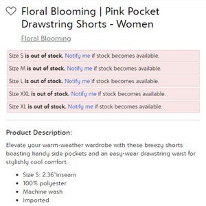 FLORAL BLOOMING Pink Pocket Drawstring Shorts w Elastic Waist & Pockets - Sz L