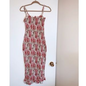 FLORAL MIDI BODYCON SHIRRED DRESS RUNWAYSCOUT