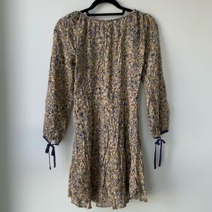 Long sleeve floral mini dress, elastic square neckline (can also be worn as an off-the-shoulder dress), small keyhole front, adjustable purple tie straps for chest and sleeves, empire waist (fitted under bodice), side zipper opening, lined