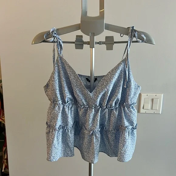 Straps tie at the top, V-neck, Flounce hem, Ruffle details. Beautiful pale blue and white daisy floral pattern throughout.