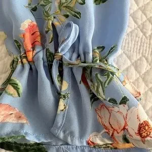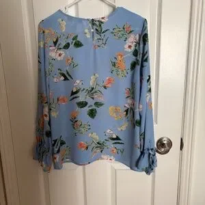 Lovely floral blue blouse with cute bow and ruffle cuffs, and pretty keyhole and blue button back closure. Perfect for Easter/spring! Washable!