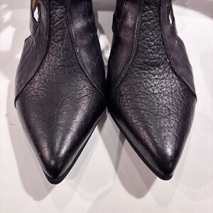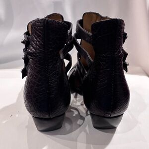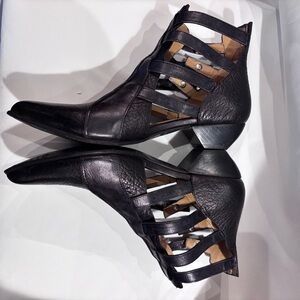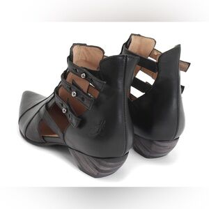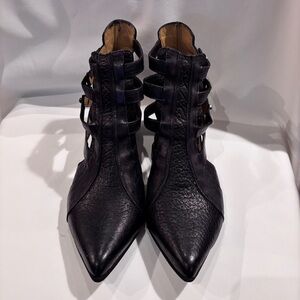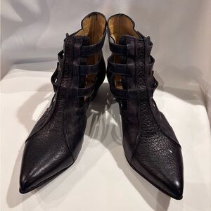 FLUEVOG TRUTH BEKKIE Sz 6 Black Strappy Leather Ankle Boots 1.5” Heel Pointy Toe