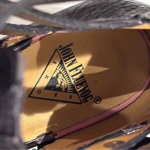 “Sun-soaked sidewalks are considered difficult terrain for the dark, brooding boots of the wintery rock and roll, which is why John set out to create a style to encourage the ladies of music to step out of the cool, dimly lit basement venues and into the sunshine. This sexy, open-sided, summery boot features a 1.5" heel and gunmetal mushroom stud fasteners. The Truth Bekkie is a wicked little boot ready to fill the void of warm-weathered, killer cool styles.” Made in Portugal. Small spot that can use a black polish touch up.