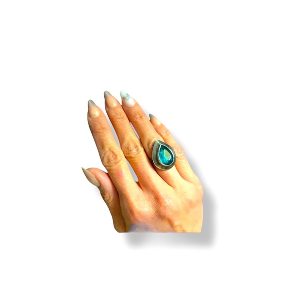 Elegant teardrop ring showcasing a captivating blue-green fluorite stone, beautifully set in 925 sterling silver. Handcrafted in Mexico, this piece adds the perfect pop of colour to elevate any outfit.