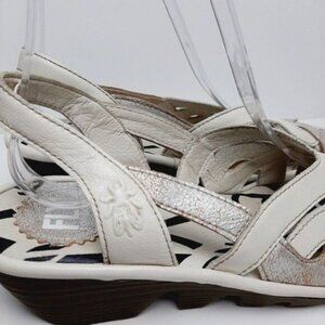 FLY LONDON Strappy Wedge Sandals Slingbacks White & Silver Sz 7.5