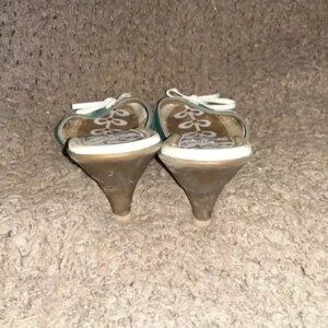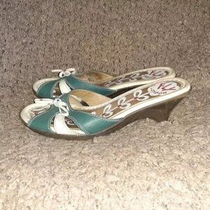 Cute and sexy pair of FLY LONDON blue and white leather, tie accent cage slide sandals featuring open toe and kitten heel. Excellent pre-owned condition. See photos for reference.
