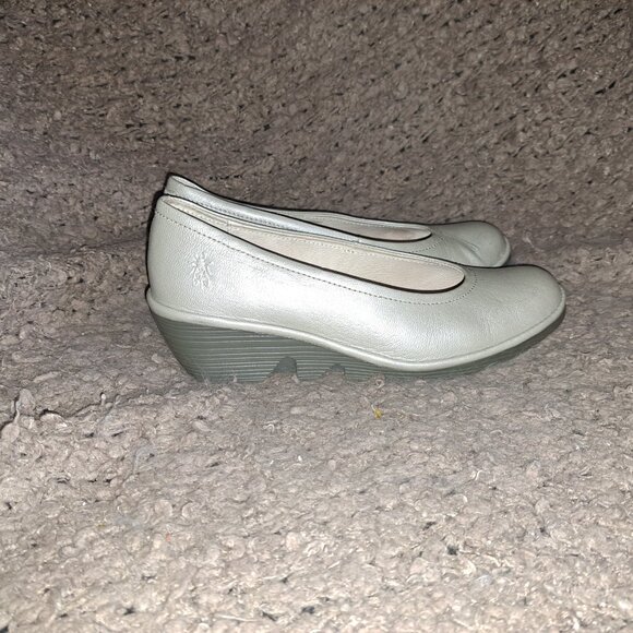 FLY LONDON-Metallic Silver Pearl-Leather-Low Wedge-Sz 38-Near Mint