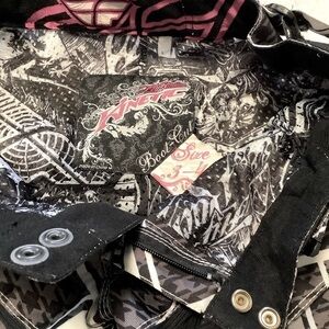 Snap and zipper fly. Adjustable Velcro waist.