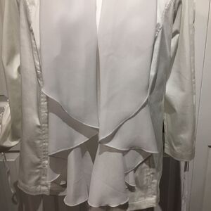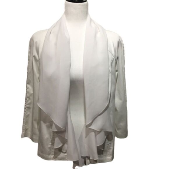 NWOT. Beautiful, feminine light weight jacket that is perfect for jeans or over a sundress. I ordered on line but doesn’t fit. Waterfall front with a crisp back for a great work to weekend look. 3/4 sleeves that can be pulled up for a ruching effect if you wish. 2 front pockets and a steam lined body make this a versatile addition to any wardrobe. Approx measurements;