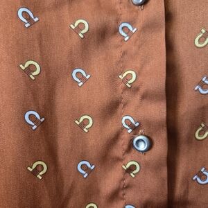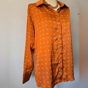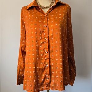 Burnt orange blouse with a yellow and white horseshoe print. Small gold button front closure. Triple button oversized cuffs.