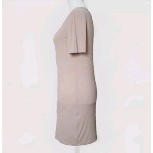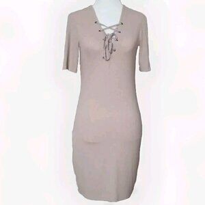 Look chic and stylish in this FOREVER 21 Bodycon Dress in size M. The dress features a solid tan color, short cap sleeves, and a pullover closure for easy wear. It is made from a stretchy knit fabric that perfectly hugs your curves, creating a flattering silhouette. Perfect for a variety of occasions such as travel, parties, casual outings, and more, this dress is a must-have for any fashion-forward woman. Its short length also makes it ideal for summer and spring seasons. Upgrade your wardrobe with this trendy and versatile dress from FOREVER 21.