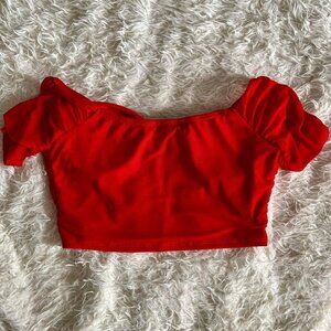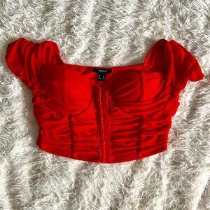 Red corset crop top with ruffle sleeves from Forever 21. The sleeves can be worn on top on shoulders or off the shoulders
