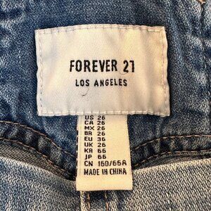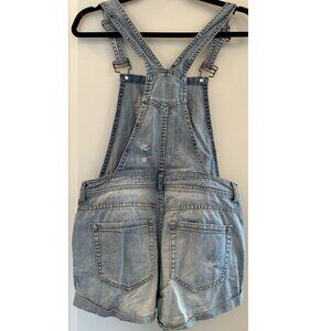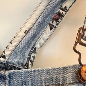 These Forever 21 Denim Overall Shorts featuring a tribal pattern and distressed details. Perfect for casual summer outings, they offer a stylish twist. Colour: Light Blue (Used - Fair)