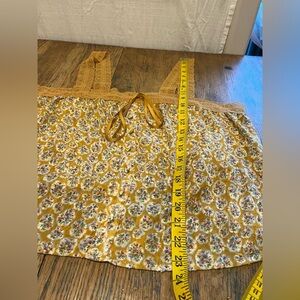 Haut court fleuri jaune moutarde avec larges bretelles en dentelle, haut smocké avec cordon décoratif à l’avant et boutons. Léger et idéal pour l’été. Taille : 0X (équivalent 18 UK).