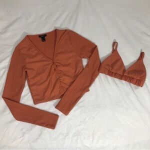 FOREVER 21 Orange 2 piece Crop Top Button up Shrug and Bralette Small