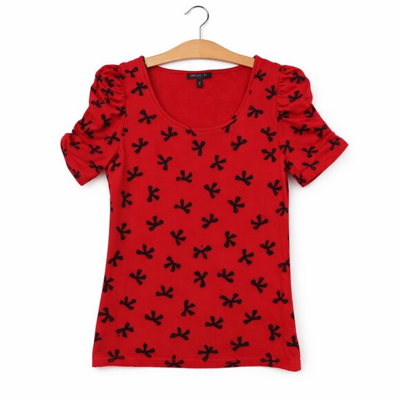 ✨ A playful and flattering red tee featuring a bold black bow print and ruched sleeves for added style and shape. Soft, comfortable, and perfect for casual outfits with a touch of fun flair.