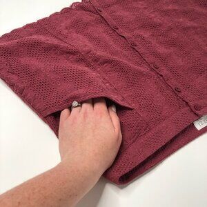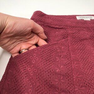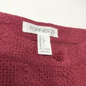 Forever 21 short mini skirt in a rich cranberry ruby burgundy dusty rose color with eyelet lace detailing with scalloped edges. Functioning buttons run the full length in the front. Slanted functioning pocket on each side. Lining underneath. Skater skirt style. Super cute for the summer paired with a white bodysuit or great color for the Fall with some over-the-knee boots and tights. In excellent like new condition with no flaws. Please see photos for measurements and details. Women's size LARGE.