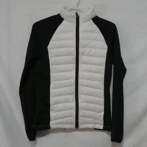 Stylish zip-up performance puffer jacket with a sleek black and white color scheme