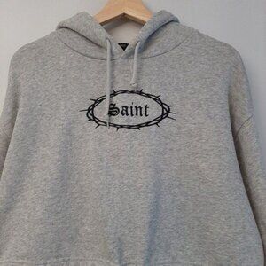• Long sleeve comfy cropped pullover hoodie top in marled grey with embroidered center "saint" circled with thorn crown. Bottom adjustable drawstring.